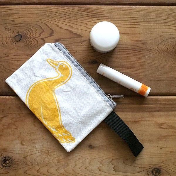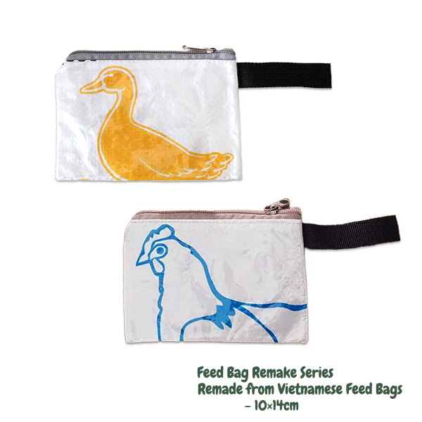 ベトナムの飼料袋をリメイクして作られたポーチです。 同じ絵柄でも表裏全く同じではないので さりげなく1点ものです。 アヒルとニワトリの線画柄が印象的なデザインです。 2種類からお選びいただけます。 表面は、ビニールでコーティングされています。 水に濡れてもサッと拭き取れて裏地も付いていて安心。 リップやネイルなどのメイク道具を入れたり 鍵をまとめて入れても便利ですね。 ちょっぴりシュールなイラストも一緒にお楽しみください! サイズ:縦約10cm×横約14cm ※サイズには若干の誤差がございます。 *ベトナム *パソコン環境によっては、色の印象が変わることも ありますので、ご了承下さいませ。 *多少のサイズの違い、ゆがみ、染色のムラ等など ある場合があります。ご了承下さい。
