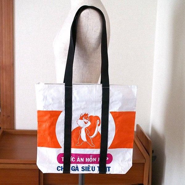 ベトナムの飼料袋をリメイクして作られたショルダーバッグです。 同じ絵柄でも表裏全く同じではないのでさりげなく1点ものです。 マチは約5cm程 チャック付きです。 内布はありますがポケット等はなくシンプルな作りです。 ナチュラルな質感で、軽やかな使い心地。 持ち手が長めなので、厚手のお洋服との相性もいいですね。 季節問わすお楽しみ下さい* ◎4つ折りでの配送になります◎ サイズ:縦約34cm×横約36cm×マチ約5cm×持ち手全長約60-61cm ※内ポケットなし 内布あり ※サイズには若干の誤差がございます。 *ベトナム *パソコン環境によっては、色の印象が変わることも ありますので、ご了承下さいませ。 *多少のサイズの違い、ゆがみ、染色のムラ等など ある場合があります。ご了承下さい。