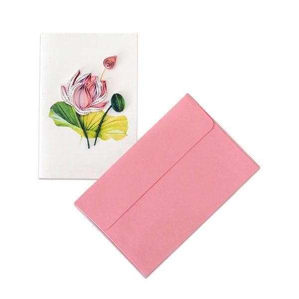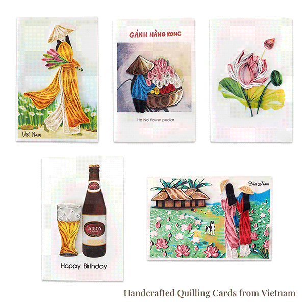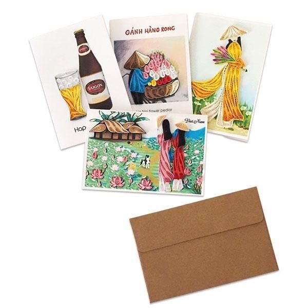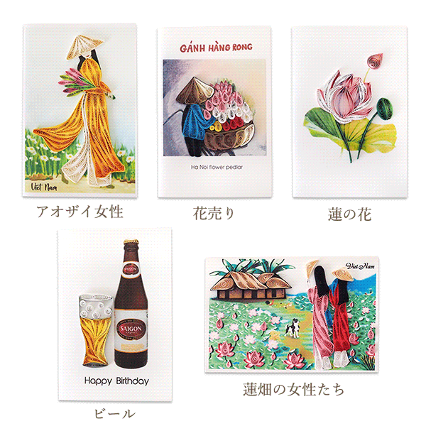 可愛い、手のひらサイズのクイリングカードです。 細い紙をくるくる巻いて作る「ペーパークイリング」で ベトナムの風景や人々の姿、蓮の花などが丁寧に表現されています。 白い紙が1枚同封されています。 たっぷりとメッセージやイラストが書けます。 全5種類の中から、お好きなデザインをお選びいただけます。 カラフルな封筒つき 飾っても贈ってもかわいいミニサイズ 小さなアートのようなカードは ギフトやお手紙にそっと添えるのもおすすめです。 サイズ:縦12cm×横8cm 封筒の大きさ 8.5×13 ※封筒の色には、濃いもの・薄いものなど少しずつ違いがあります。 ※サイズには若干の誤差がございます。 素材:紙 *パソコン環境によっては、色の印象が変わることも ありますので、ご了承下さいませ。 *多少のサイズの違い、ゆがみ、染色のムラ等など ある場合があります。ご了承下さい