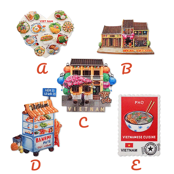 ベトナムの人気モチーフをぎゅっと詰め込んだ、お土産風マグネットです。 ホイアンの街並み、フォーやバインミーなどのローカルフード レトロな屋台まで、見ているだけで旅気分がよみがえるデザインばかり。 5種類からお選びいただけます。 冷蔵庫やデスク周りのアクセントに飾ったり 旅好きさんへのプチギフトにもぴったりのアイテムです。 サイズ:A 縦約6cm×横約7.5cm×厚み約1cm B 縦約4.5cm×横約7.5cm×厚み約1cm C 縦約7cm×横約8cm×厚み約1cm D 縦約8.5cm×横約6cm×厚み約1cm E 縦約7.5cm×横約5.5cm×厚み約1cm ※サイズには若干の誤差がございます。 *ベトナム *パソコン環境によっては、色の印象が変わることも ありますので、ご了承下さいませ。 *現地で直接購入の為、色ハゲ・キズなどがございます。 現地の香りとして、ご理解頂ければ幸いです。