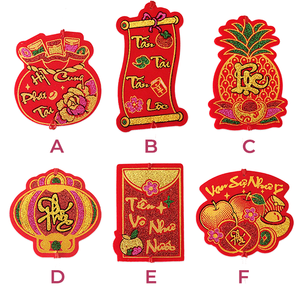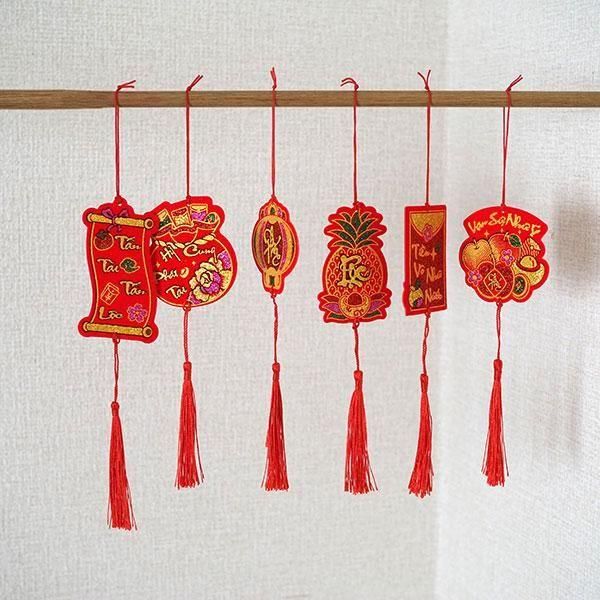 可愛いモチーフにベトナムの縁起の良い言葉や モチーフが書かれたタッセルチャームです。 それぞれに「商売繁盛」「金運」「健康」「成功」「新年の祝福」など 願いのこもった意味が書かれています。 6種類からお選びいただけます。 玄関や壁、棚、ドアノブに吊るすだけで お部屋にぱっと明るい福の気配を運んでくれそうですね。 お店の開運飾りや、さりげない贈りものにもおすすめです。 サイズ:全長約 約25-27cm パーツ A 縦約6.5cm×横約6.5cm B 縦約9cm×横約5cm C 縦約7.5cm×横約5cm D 縦約6cm×横約6.5cm E 縦約6.5cm×横約5cm F 縦約6cm×横約7cm ※サイズには若干の誤差がございます。 *ベトナム *パソコン環境によっては、色の印象が変わることも ありますので、ご了承下さいませ。 *多少のサイズの違い、ゆがみ、染色のムラ等など ある場合があります。ご了承下さい。