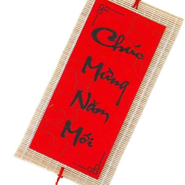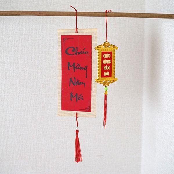 赤い紙に描かれたベトナムの縁起メッセージを 竹フレームで仕立てた正月飾りチャームです。 Chúc Mừng Năm Mới「新年おめでとうございます」 竹素材のやさしい雰囲気と、赤のタッセルで華やかさが増します。 玄関・壁・棚・ドアノブなど、場所を選ばず気軽に飾れますね。 お正月飾りや、1年のお守り代わりなど・・・ インテリア雑貨としてもおすすめです。 サイズ:全長約 約37cm パーツ 縦約19cm×横約9cm ※サイズには若干の誤差がございます。 *ベトナム *パソコン環境によっては、色の印象が変わることも ありますので、ご了承下さいませ。 *多少のサイズの違い、ゆがみ、染色のムラ等など ある場合があります。ご了承下さい。
