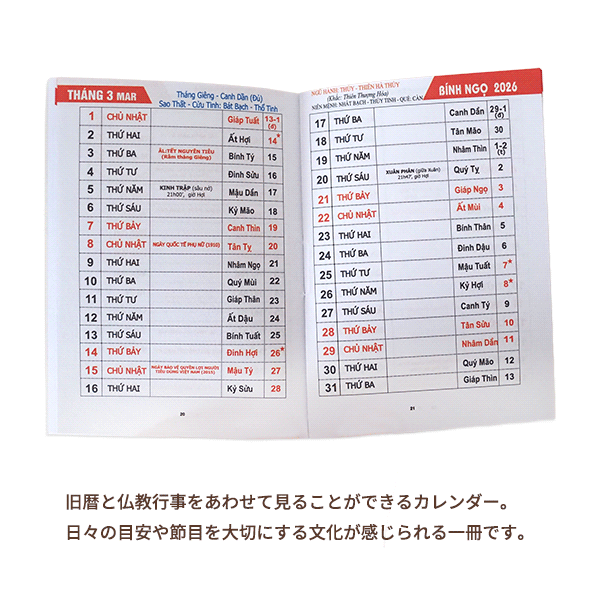 旧暦と仏教行事をあわせて見ることができるカレンダーです。 日付には旧暦表記や節目となる行事が記され 日々の暮らしの中で「今日はどんな日か」を ふと振り返ることができます。 実用手帳というよりも、文化や信仰の背景を感じながら 眺めて楽しむ一冊です。 2種類からお選びいただけます。 メモができるページが約4ページほどあります ちょっとした覚え書きや気づきを書き留めたり ベトナム語に触れながらお楽しみください。 サイズ:縦約9.5cm×横約7cm ※サイズには若干の誤差がございます。 *ベトナム *パソコン環境によっては、色の印象が変わることも ありますので、ご了承下さいませ。 *多少のサイズの違い、ゆがみ、染色のムラ等など ある場合があります。ご了承下さい。
