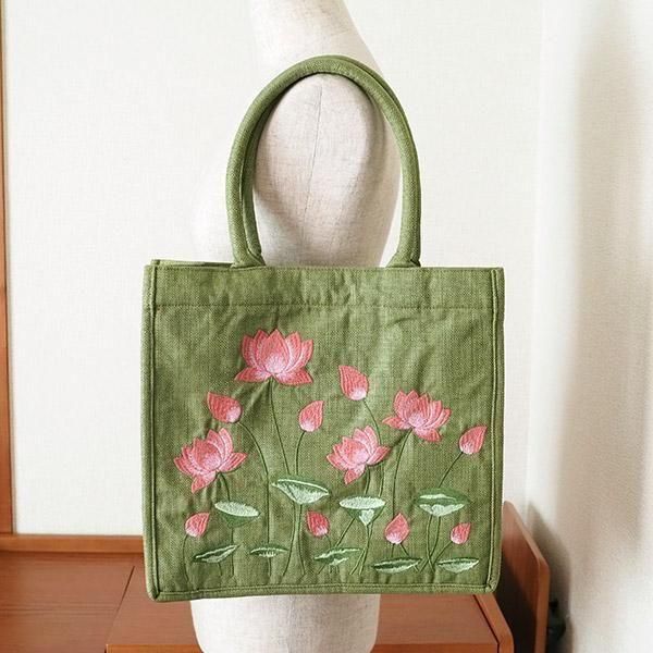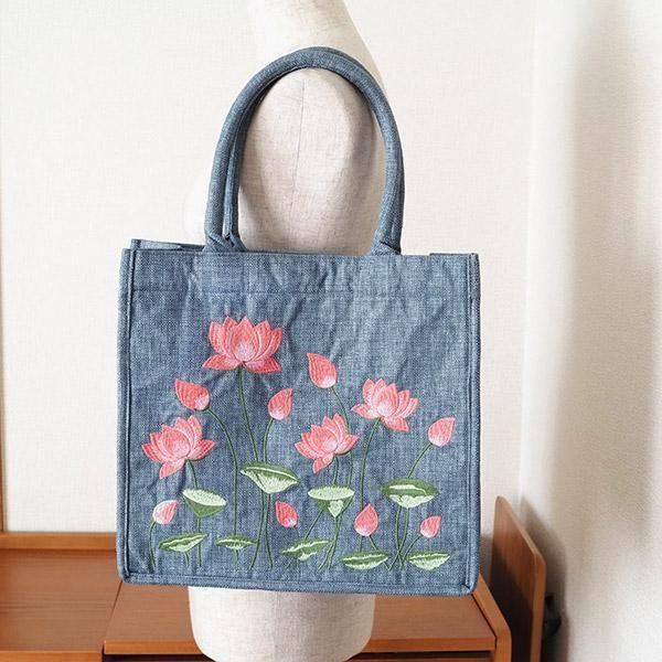 やさしい色合いの生地に 可憐な蓮の花刺繍が咲くショルダーバッグです。 蓮モチーフが上品で、和装・洋装どちらにも合わせやすいデザイン。 マチ付き、裏面にはファスナーポケット付き。 内ポケットも付いているので、スマホや鍵・ICカードの定位置に便利です。 日常で活躍する実用性も備えています。 落ち着いたグリーンとナチュラルなデニム調の 2色からお選びいただけます。 カジュアル&フォーマルどちらにも合わせやすい しっとりと大人イメージの刺繍バッグです。 サイズ:縦約32cm×横約35cm×マチ約12cm×持ち手全長約50cm ※サイズには若干の誤差がございます。 *ベトナム *パソコン環境によっては、色の印象が変わることも ありますので、ご了承下さいませ。 *現地にて直接購入の為 若干の糸のほつれや汚れがある場合がございます *多少のサイズの違い、ゆがみ、染色のムラ等など ある場合があります。ご了承下さい。 *強い摩擦や、雨などにより色落ちする場合があります。